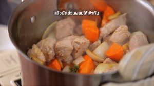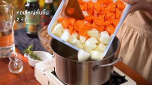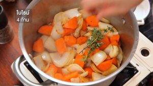 ใช้หม้อเดิม ใส่หอมใหญ่ แครอท และกระเทียม ผัดจนผักเริ่มเปลี่ยนสี