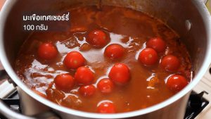 ครบเวลา ใส่มะเขือเทศเชอร์รีลงไป ตุ๋นต่ออีก 30 นาที จนหมูนุ่มและมะเขือเทศเปื่อย
