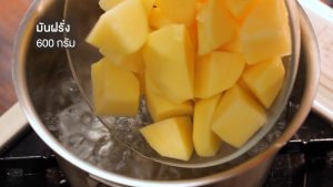 นำมันฝรั่งหั่นชิ้นและกระเทียมลงต้มในน้ำเดือด