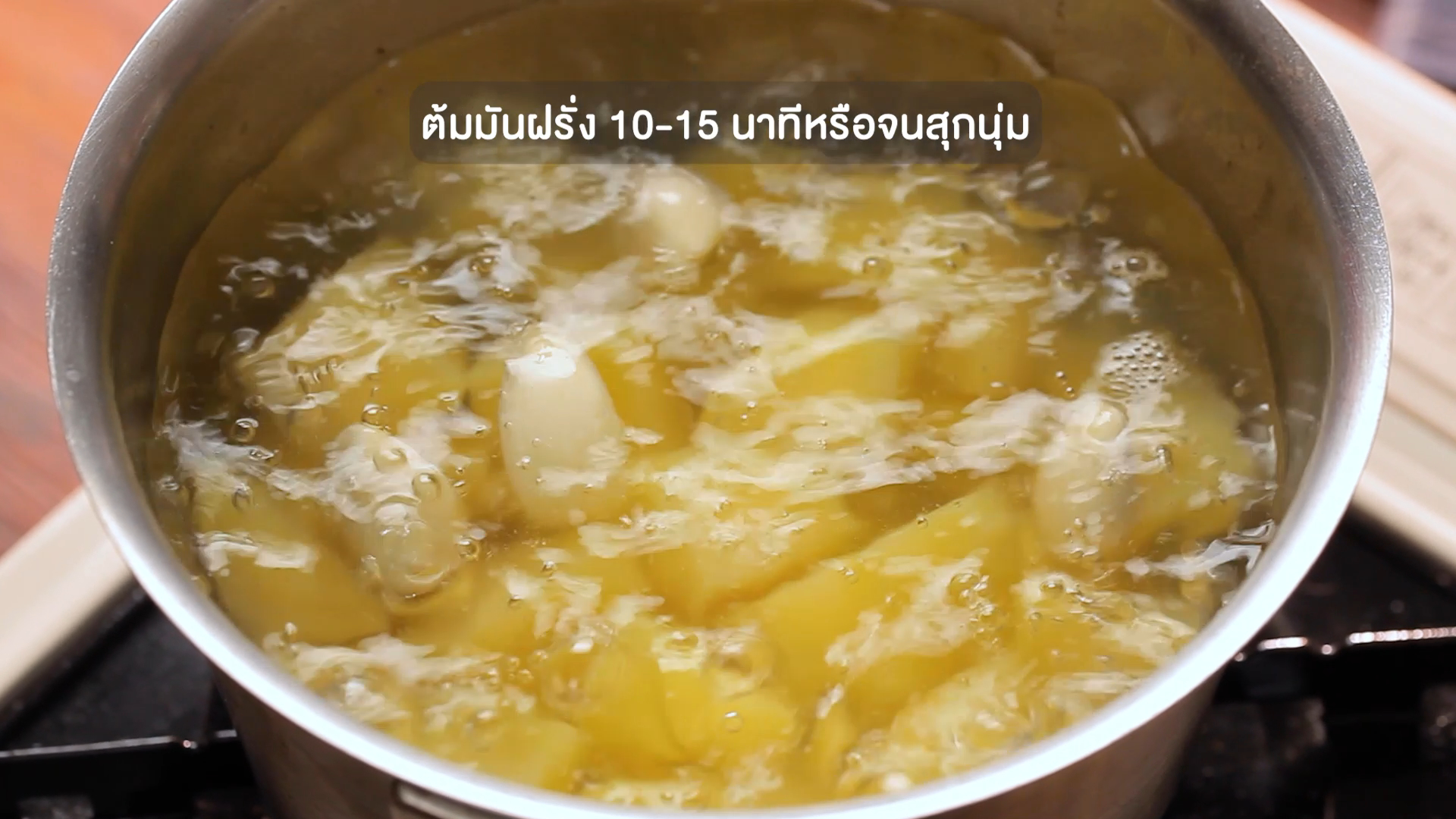 ต้มประมาณ 10–15 นาที หรือจนมันฝรั่งสุกนุ่ม