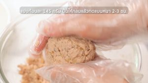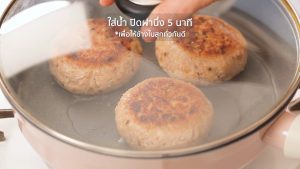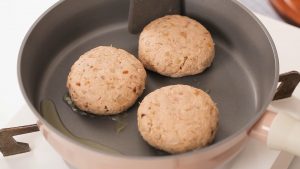 5.นำแฮมเบิร์กทูน่าก้อนที่ปั้นไว้ลงไปทอดบนไฟกลางทั้ง 2 ด้านจนมีสีน้ำตาลสวย