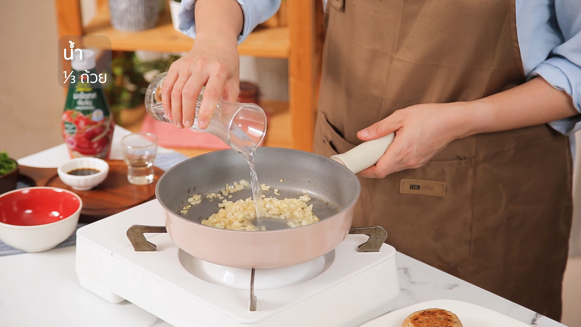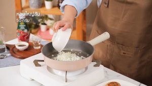 1.นำหอมใหญ่สับละเอียดที่เหลือลงไปผัดให้สุกและสีใส