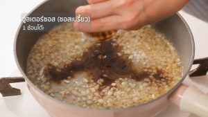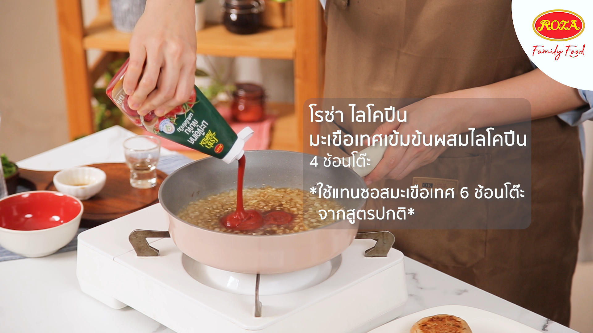 2.เติมน้ำ ปรุงรสด้วยโรซ่า ไลโคปีน มะเขือเทศเข้มข้นผสมไลโคปีน และวูสเตอร์ซอส(ซอสเปรี้ยว) เคี่ยวจนซอสมีลักษณะข้นเล็กน้อย