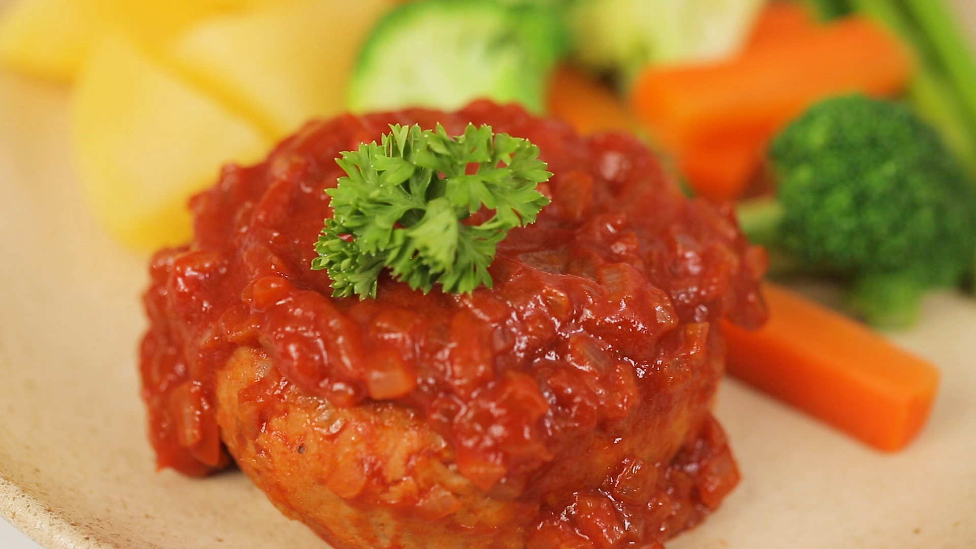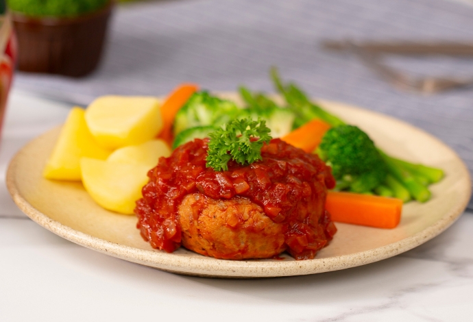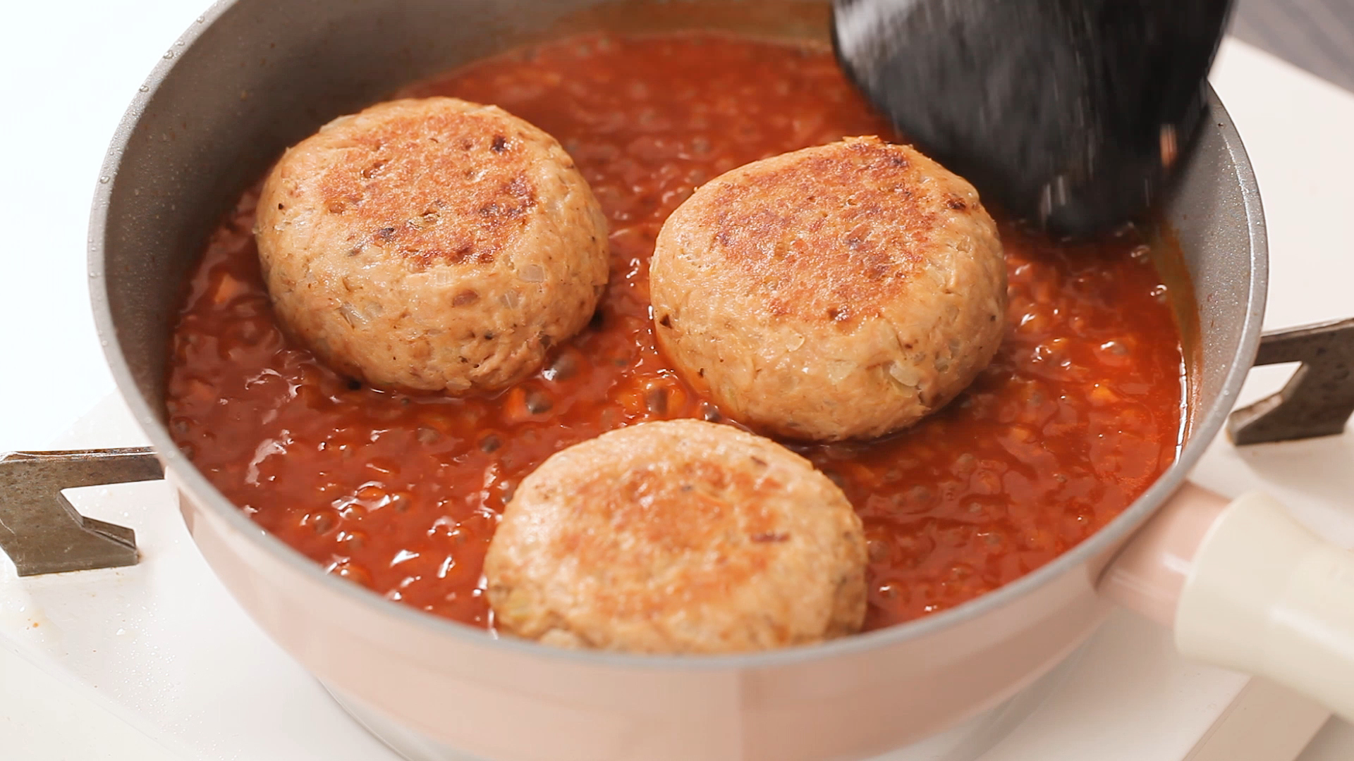 แฮมเบิร์กทูน่าซอสไลโคปีน เปลี่ยนจากเนื้อปกติเป็นเนื้อปลาทูน่า ราดด้วยซอสไลโคปีนฉ่ำๆ อร่อยเหมือนเดิมแต่เฮลท์ตี้ขึ้นเยอะ!