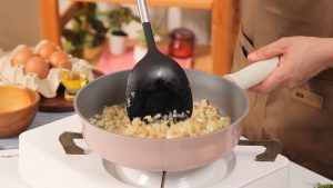 3.นำแฮมเบิร์กทูน่าลงไปคลุกต่อในกระทะ ตักซอสราดให้เคลือบทั่วทั้งก้อน