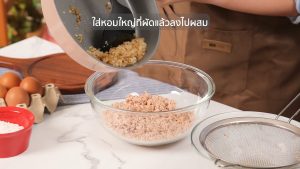 2.นำหอมใหญ่สับละเอียดลงไปผัดบนไฟกลางจนสุกสีใส และใส่ลงในอ่างผสมทูน่า