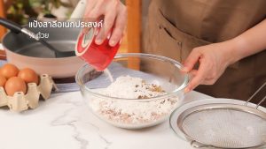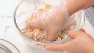 3.ในอ่างเดิม ใส่แป้งสาลีอเนกประสงค์ ไข่ไก่ ปรุงรสด้วยพริกไทยดำป่น และใช้มือนวดส่วนผสมจนเนื้อเข้ากันดี