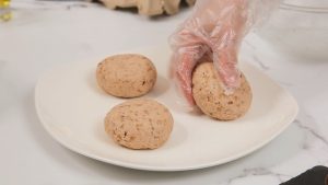 4.แบ่งก้อนละ 140-145 กรัม ปั้นให้กลมแล้วกดแบนหนา 2-3 ซม.