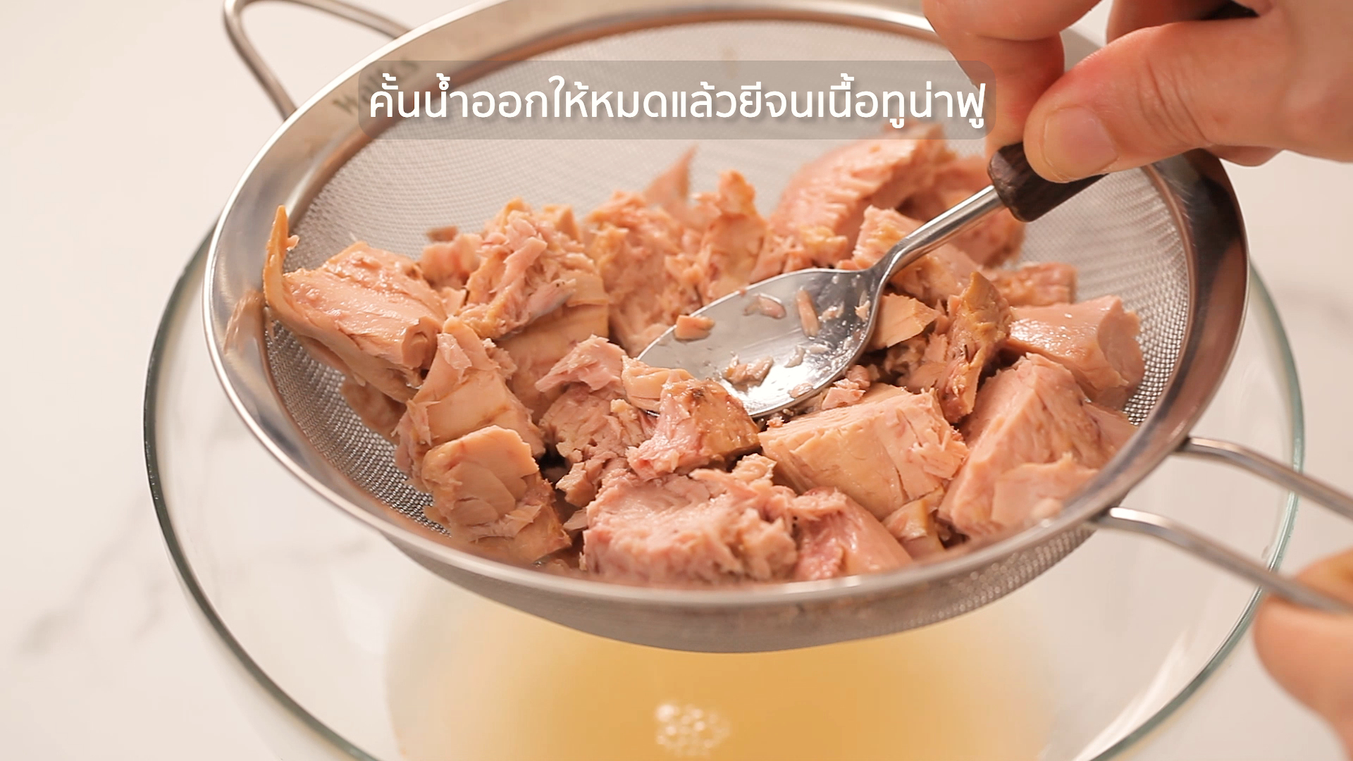 1.นำโรซ่า ทูน่าก้อนในน้ำเกลือ กรองน้ำออกให้หมดแล้วยีจนเนื้อทูน่าฟู ใส่อ่างผสมเตรียมไว้