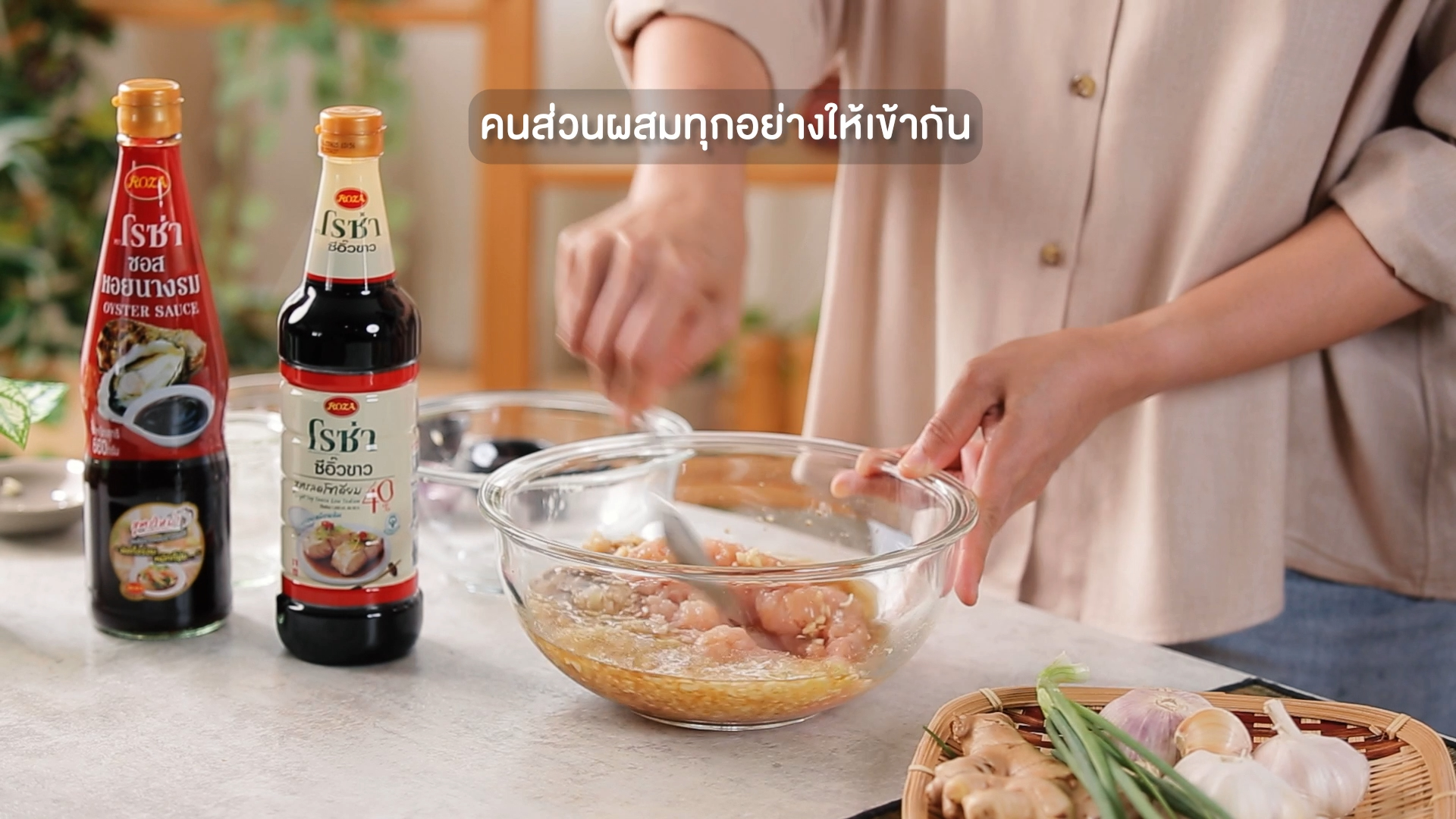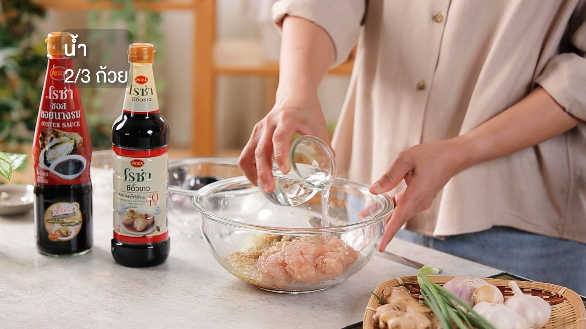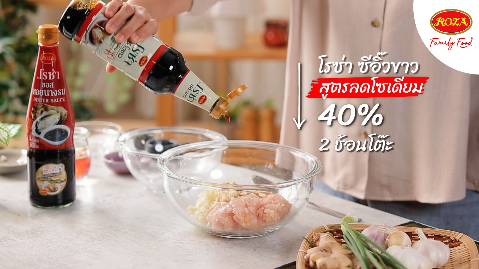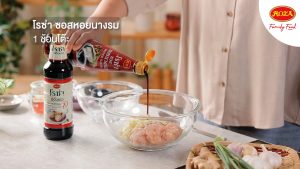 2. ปรุงรสด้วยโรซ่า ซอสหอยนางรม 1 ช้อนโต๊ะ โรซ่า ซีอิ๊วขาวสูตรลดโซเดียม 40% 2 ช้อนโต๊ะ เติมน้ำมันงา น้ำตาลทรายขาว และพริกไทยขาวป่น