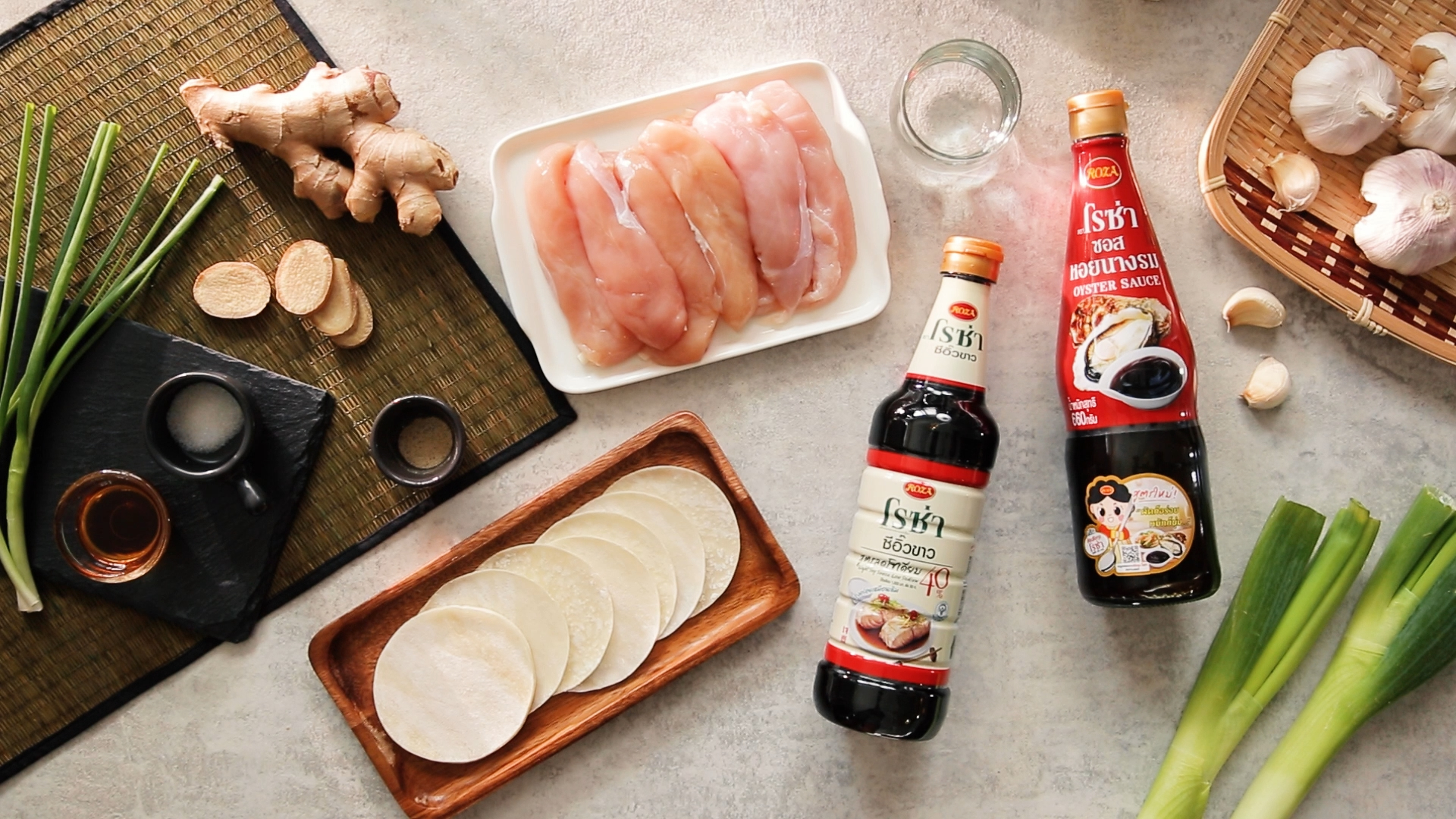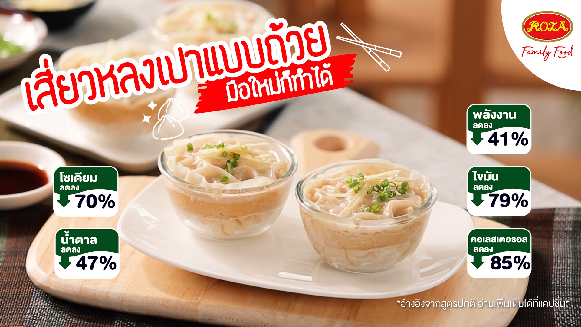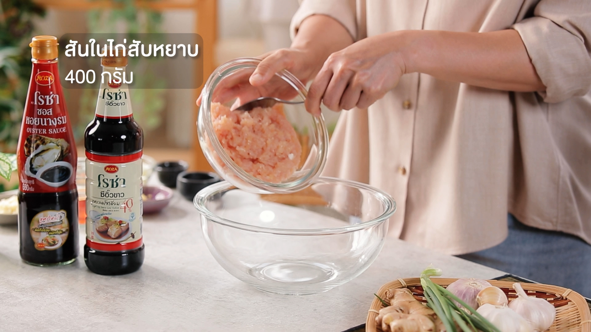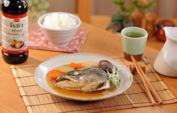 2. ปรุงรสด้วยโรซ่า ซอสหอยนางรม 1 ช้อนโต๊ะ โรซ่า ซีอิ๊วขาวสูตรลดโซเดียม 40% 2 ช้อนโต๊ะ เติมน้ำมันงา น้ำตาลทรายขาว และพริกไทยขาวป่น