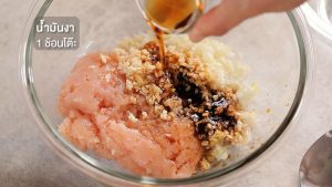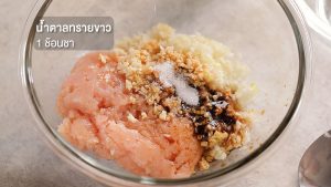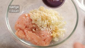 1. ใส่สันในไก่สับหยาบ ต้นหอมญี่ปุ่นสับหยาบ กระเทียมกลีบใหญ่สับละเอียด ขิงแก่ขูด ในถ้วยผสม