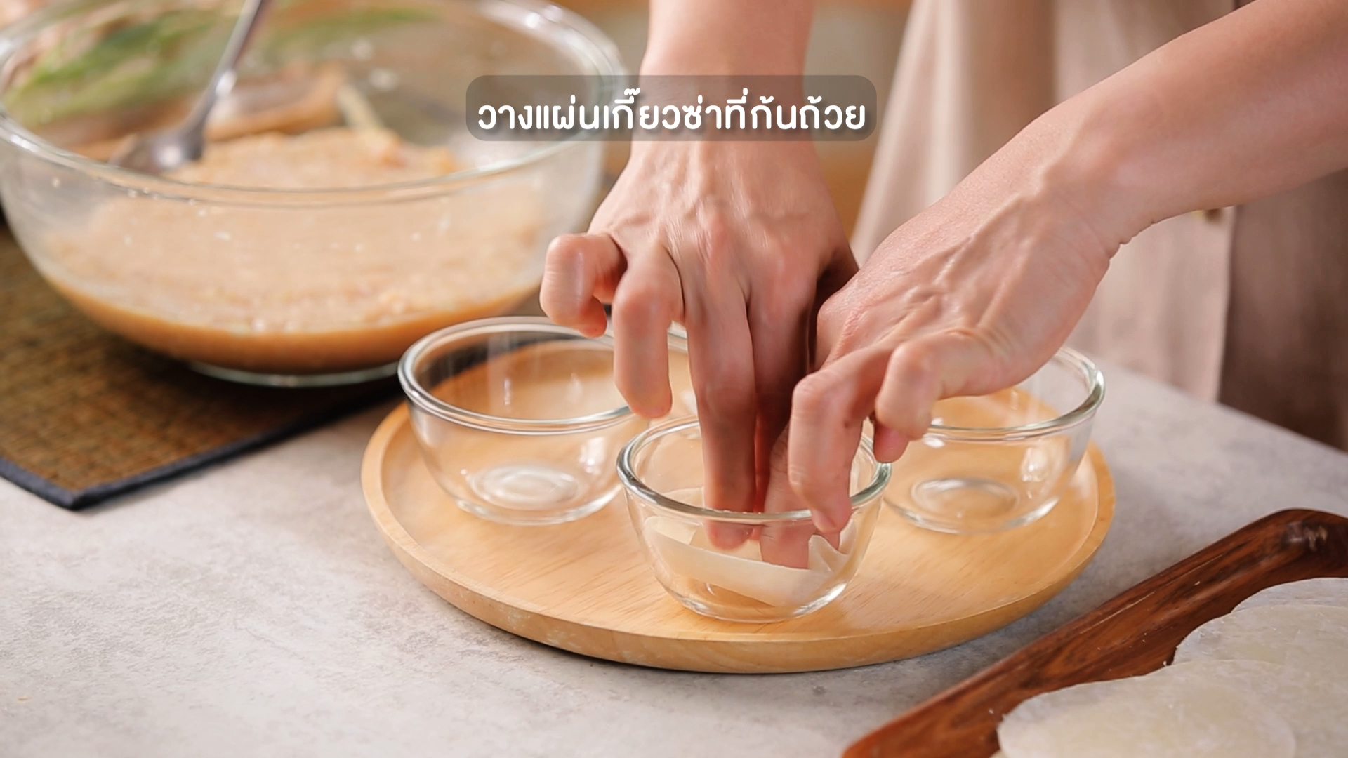 1. วางแผ่นแป้งเกี๊ยวซ่าที่ก้นถ้วย