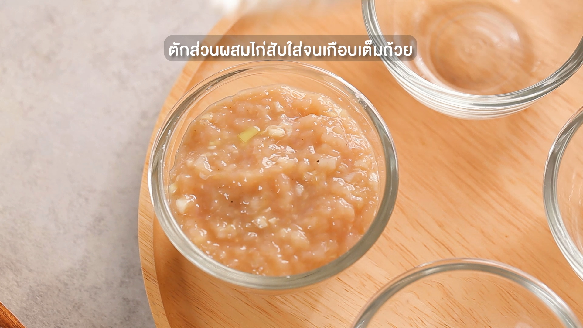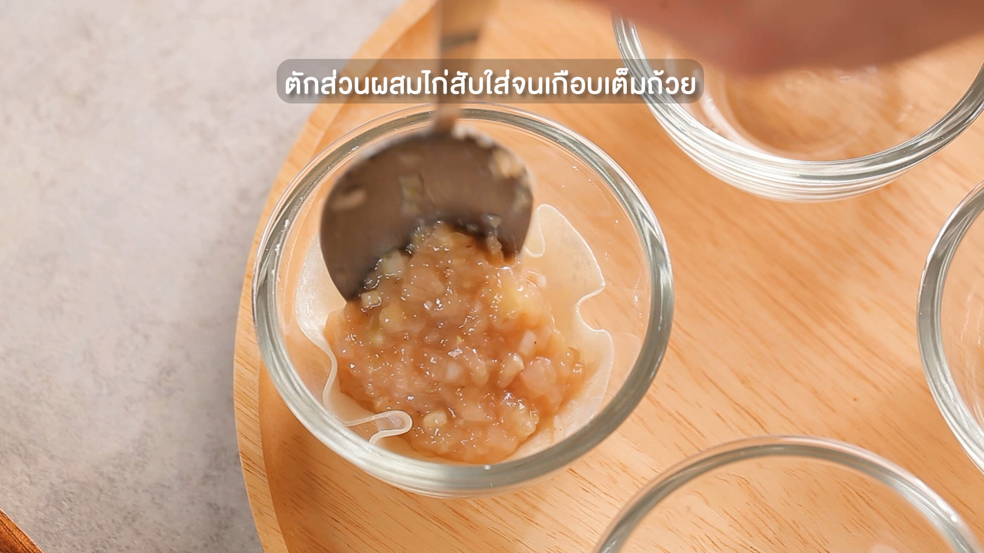 2. ตักส่วนผสมไก่สับใส่จนเกือบเต็มถ้วย